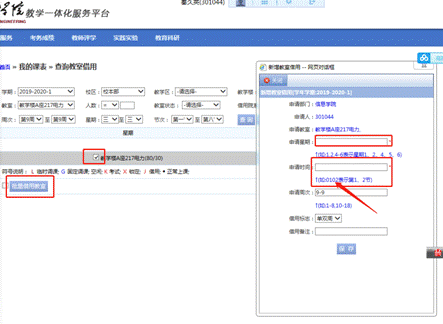 二、查询到符合条件的教室,勾选想要借用的教室,点击批量借用教室,填写借用的时间、周次、理由等内容。