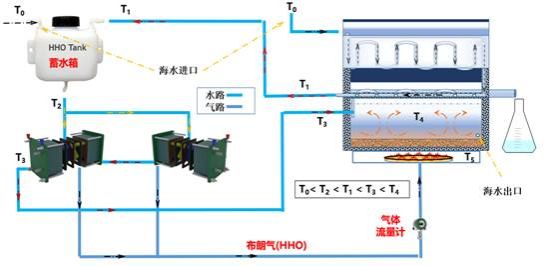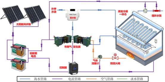 利用海水循环系统有效回收蒸汽凝结潜热和布朗气发生器放热,在提升布朗气发生器性能的同时,实现了海水淡化前的预热;通过监测蒸发水槽温度实时调控布朗气发生器产气量,实现海水淡化最佳经济性,有效降低系统能耗,提升淡化效率。淡化蒸馏水产出率是传统太阳能海水蒸馏淡化系统的5倍。