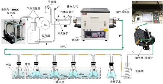 生物质热解作为一种生物质能高效利用技术,可以缓解我国不可再生能源的严重消耗问题。而焦油作为生物质热解过程的中间产物,其低温下易冷凝造成设备堵塞或腐蚀,降低了生物质热解效率。布朗气作为一种新型氢氧混合新能源气体,含有大量的-H、-OH、-O等活性自由基,可促进燃料中高碳氢链的裂解, 使氧化反应速度加快, 起到催化燃烧的效果。项目团队提出了在生物质热解过程中通入少量布朗气来促进生物质热解过程中焦油的裂解的新方法,设计了布朗气绿氢复合气-生物质热解焦油催化裂解固定床实验,分别探究了以下两个方面内容: